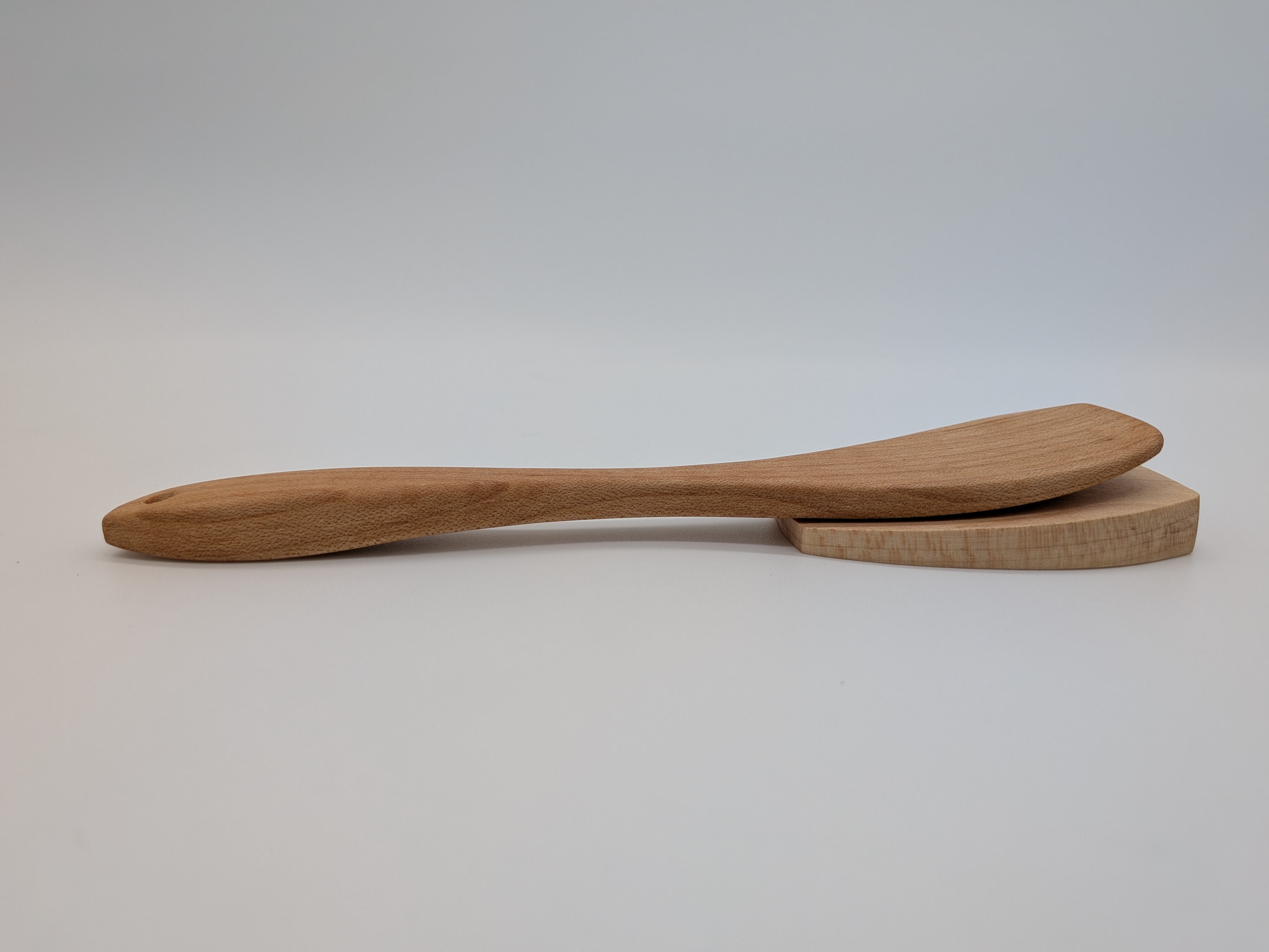I cut each individual utensil to its rough shape on the bandsaw and then shape it on a belt sander before hand sanding and finishing with organic distilled coconut oil. (The spoon rest, which does not come into contact with food, was finished with spar urethane.) No step in the process is automated.