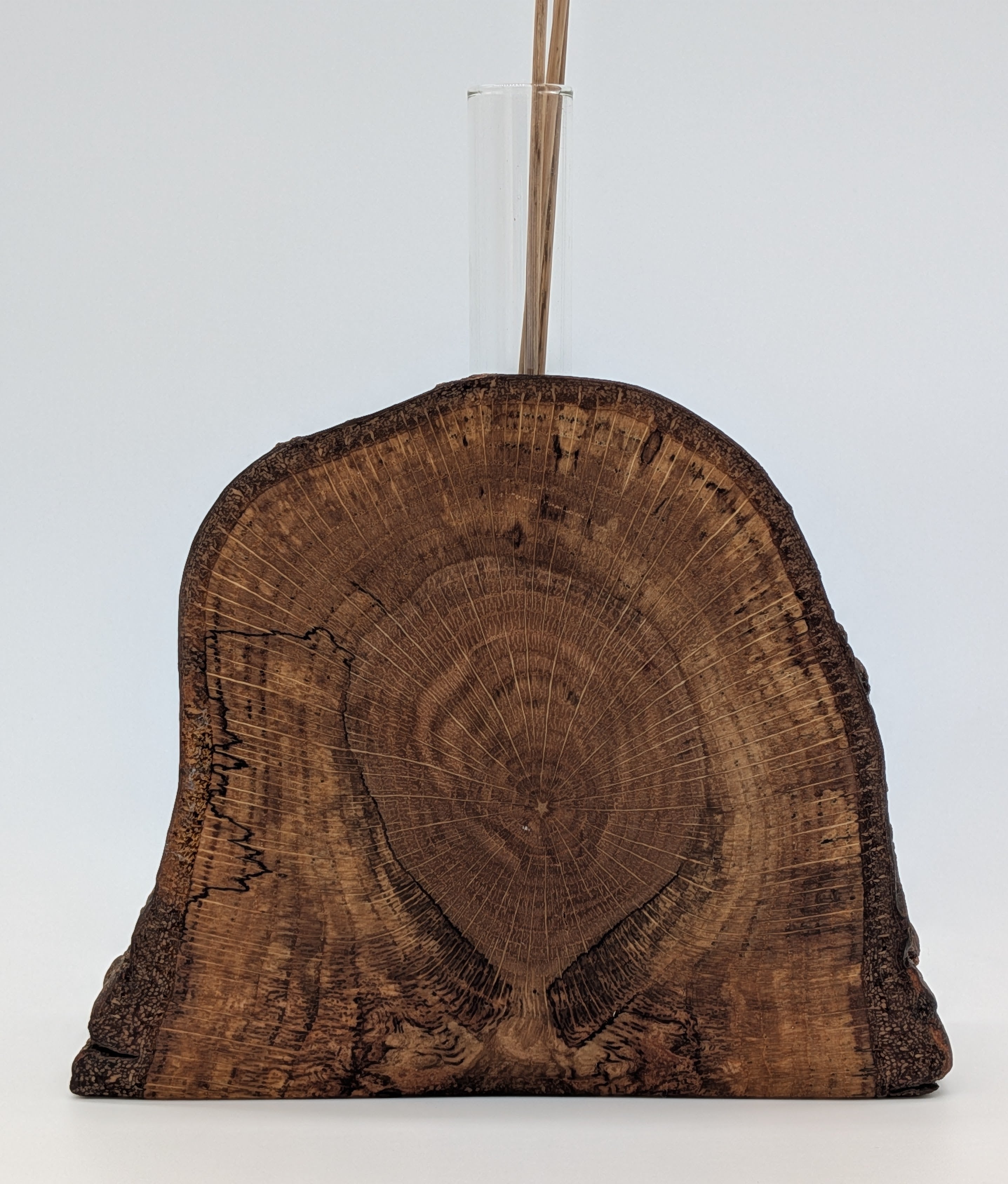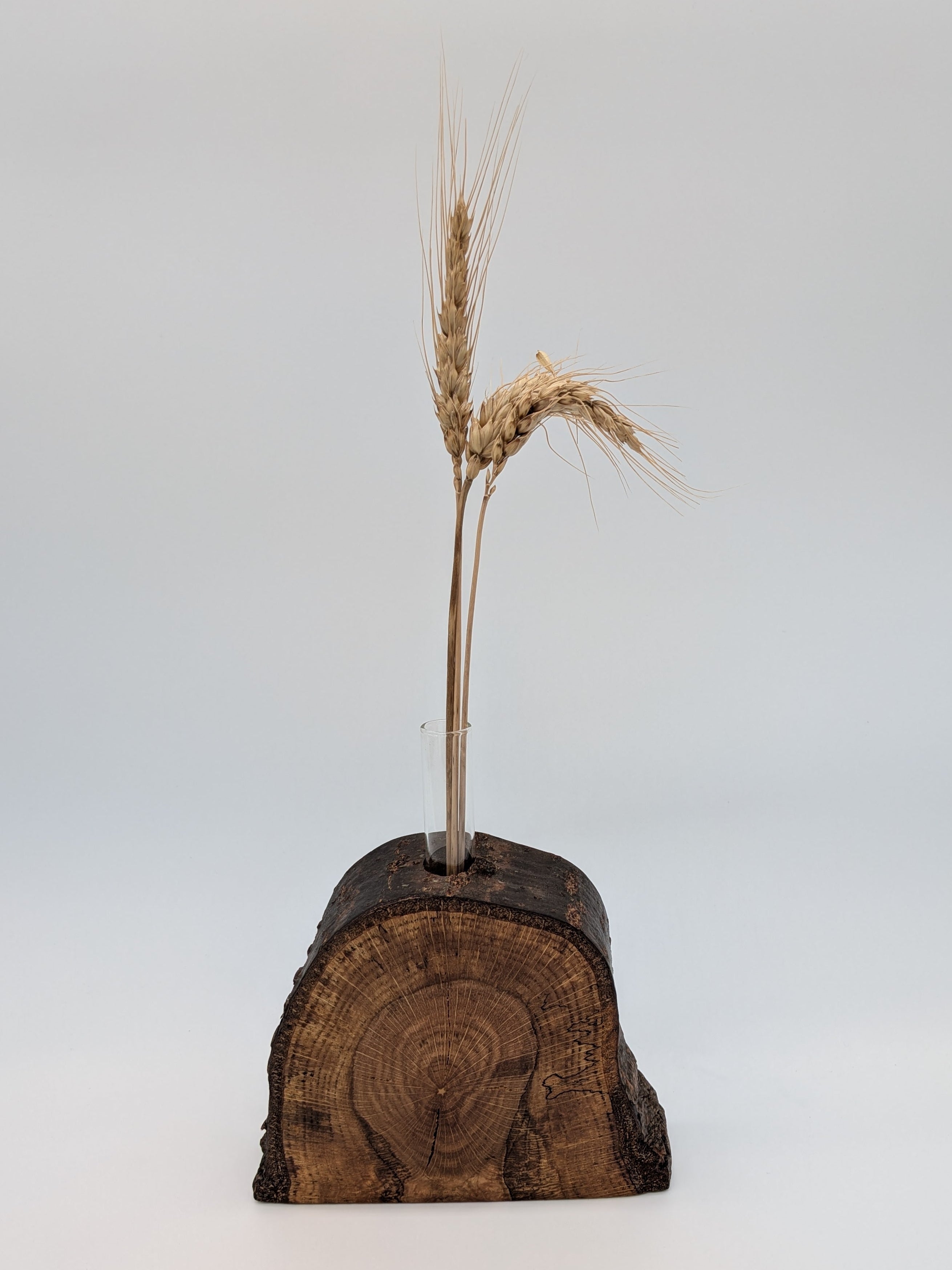This vase highlights the intricate natural patterns in this piece of wood from my parents' back yard near Kalamazoo, Michigan. If you zoom on the photos, you might be able to see a nearly perfect star at the very center of the piece. The wood is 4" tall, with the glass insert reaching two inches higher. (Wheat stalks not included.)
