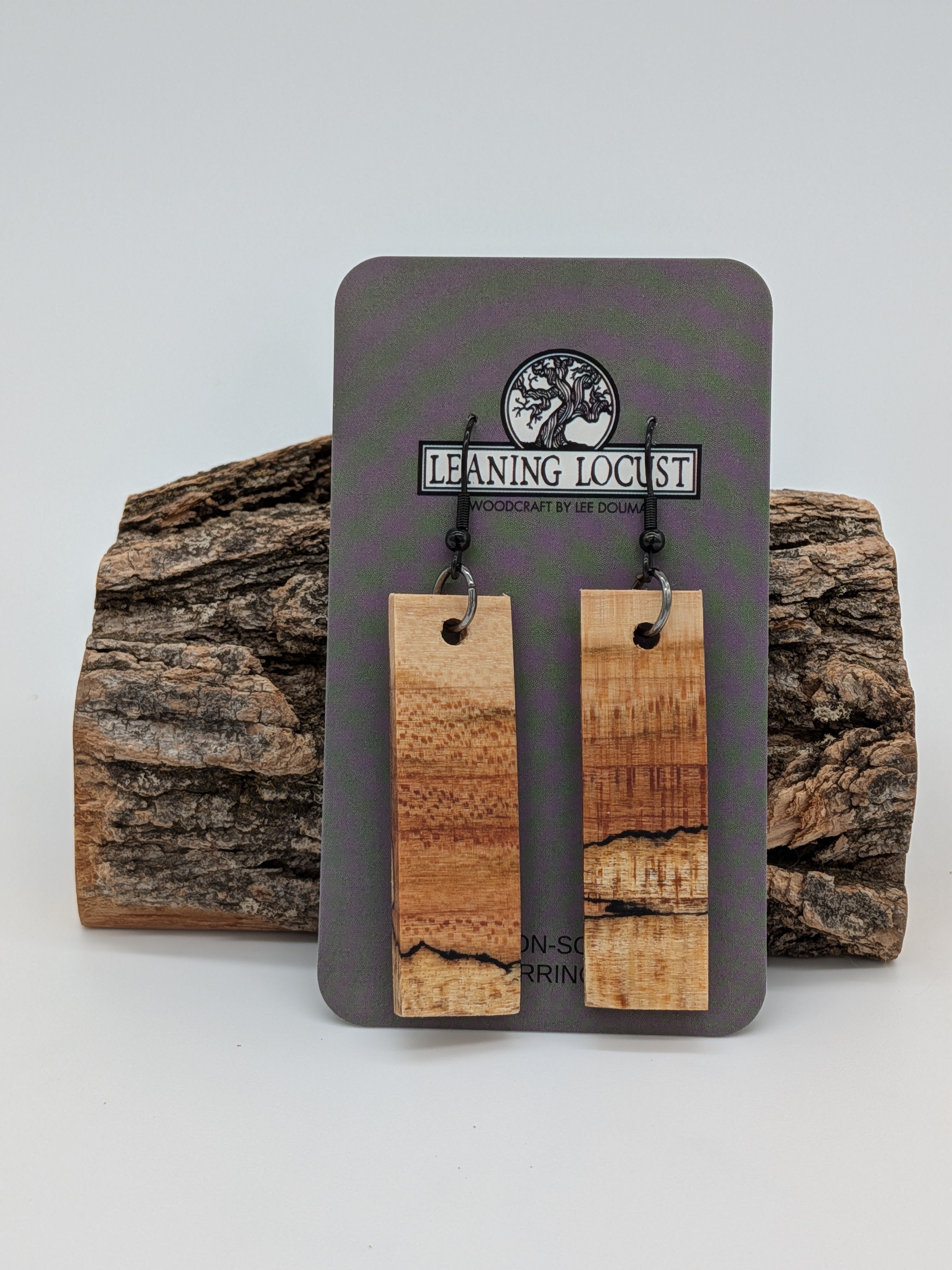 These “spoon-scrap earrings” were made either from pieces of wood that were either  left over from the production of spoons or wood that were beautiful but not strong enough to become a utensil. This particular wood came from the back yard of some friends a few miles down the road.