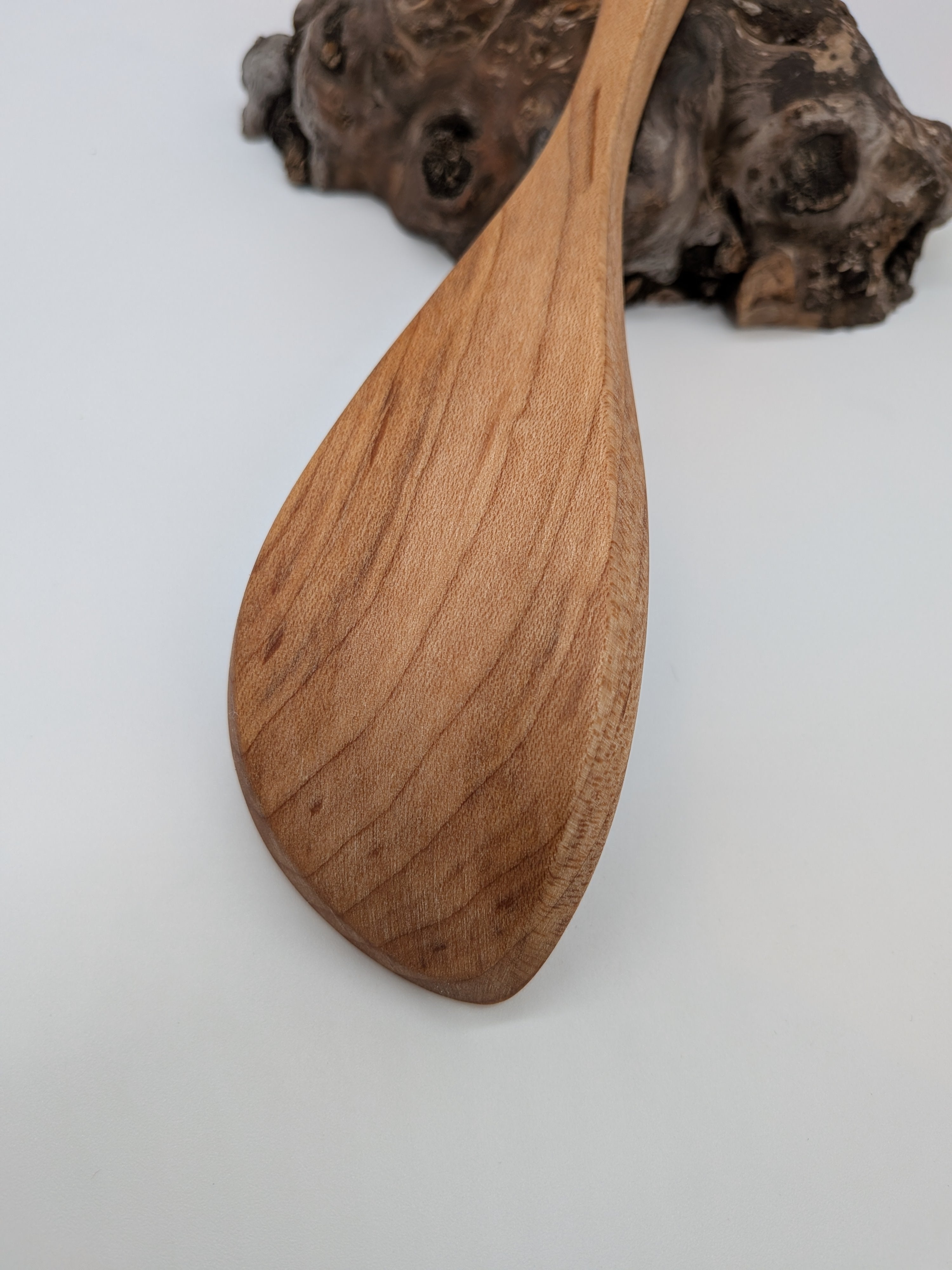 The curves of this design enable it to hug both the side and bottom of most cooking pans while being used by a right-handed cook. The spoon bowl makes it a useful tool not just for sautéing and stirring but also for serving. It has a relatively slim handle.