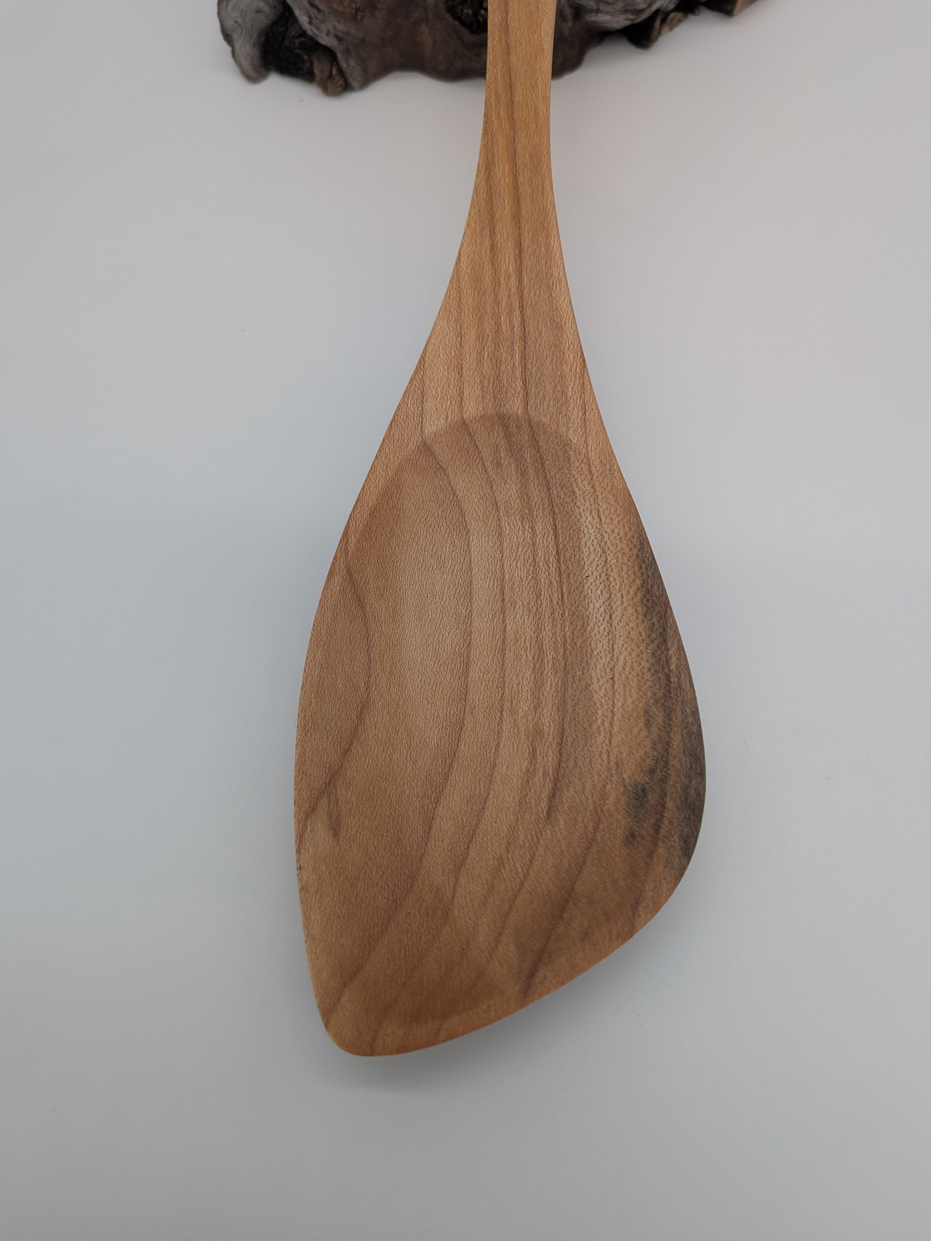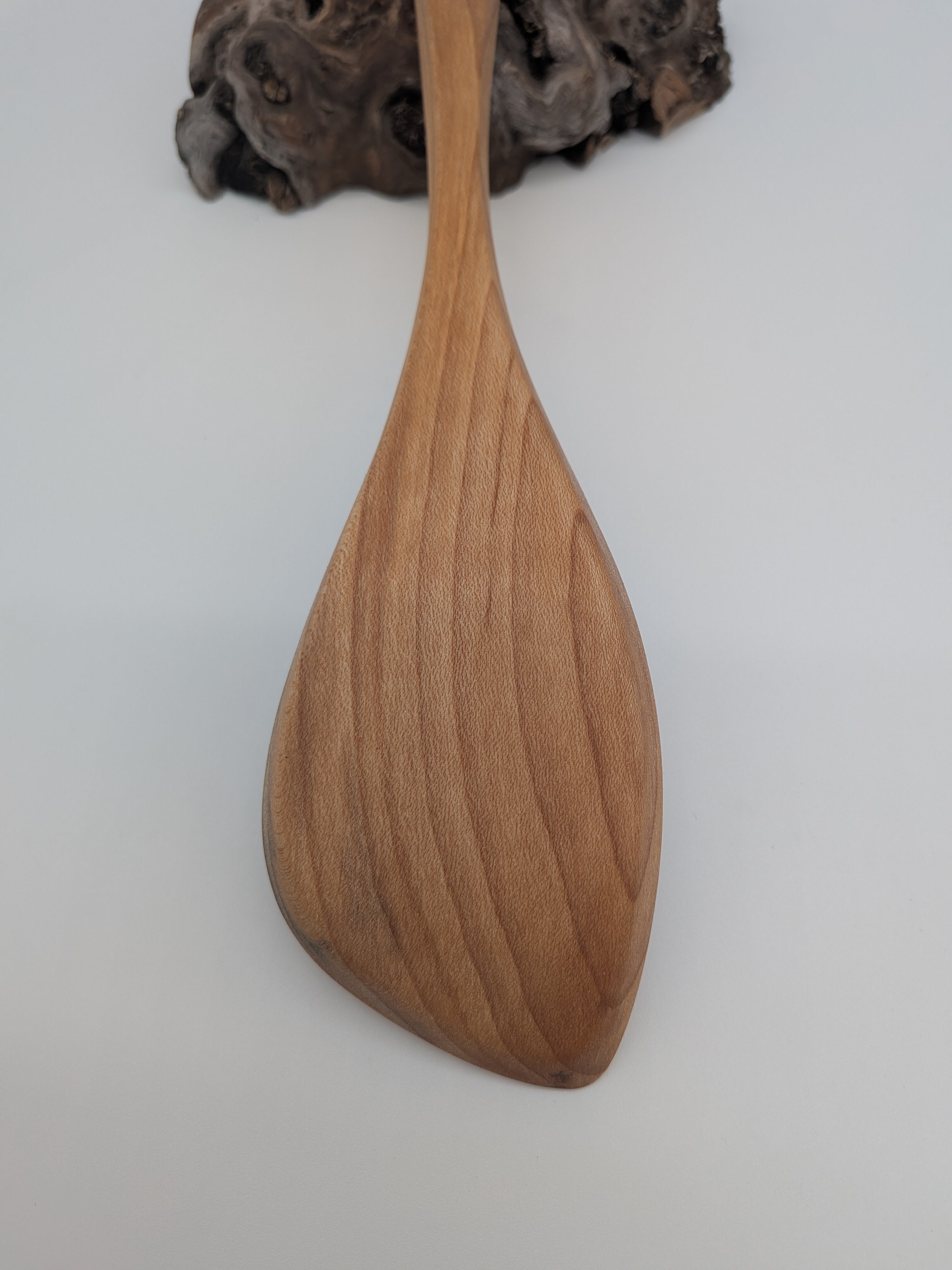 The curves of this design enable it to hug both the side and bottom of most cooking pans while being used by a right-handed cook. The spoon bowl makes it a useful tool not just for sautéing and stirring but also for serving.