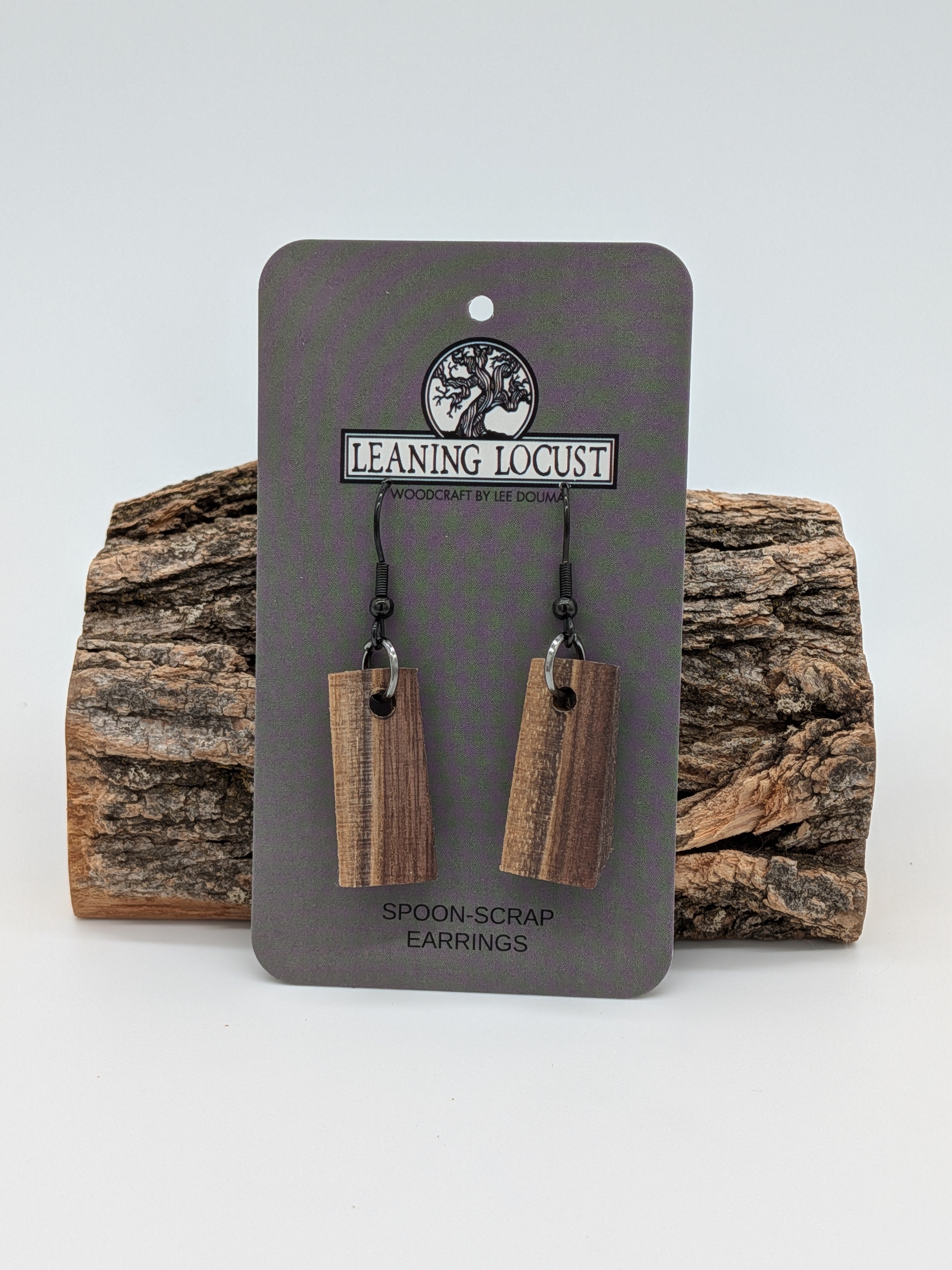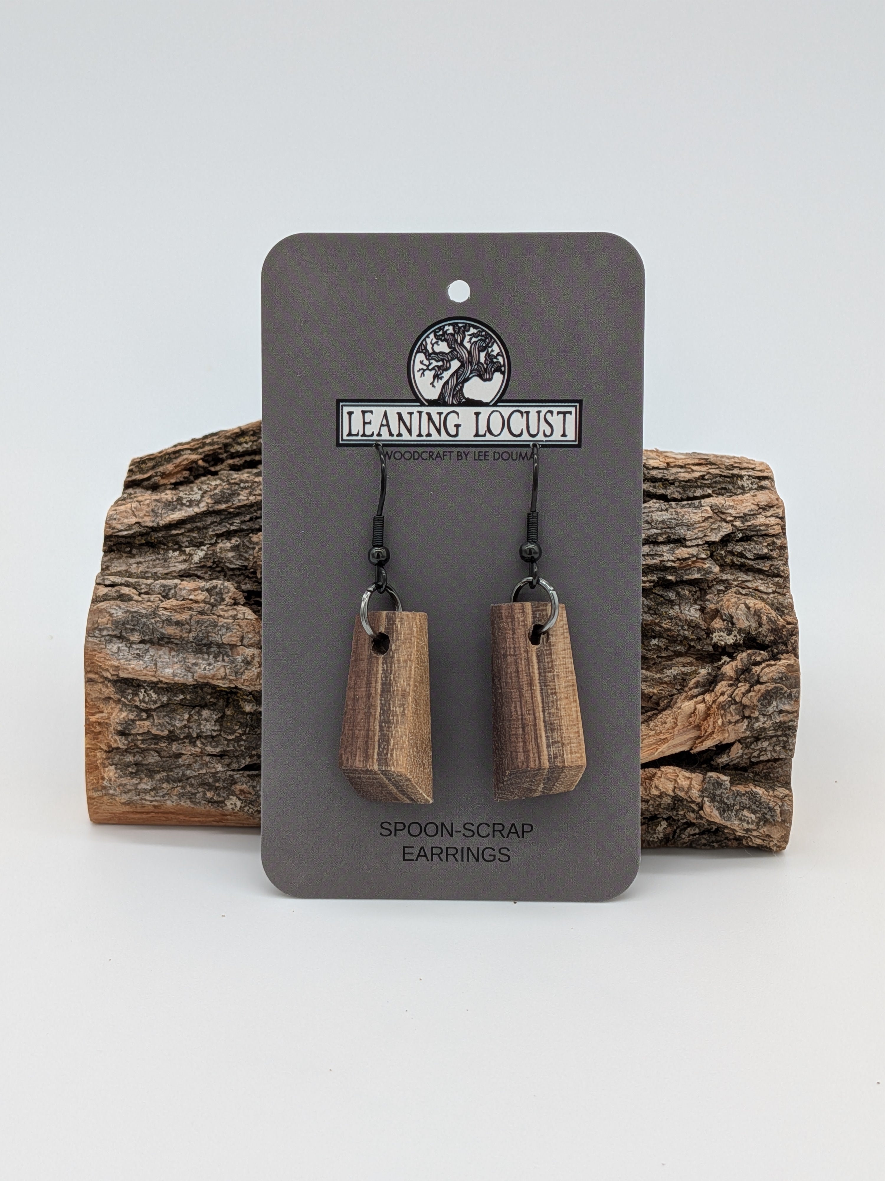 These “spoon-scrap earrings” were made from pieces of wood that were left over from the production of spoons. This particular wood came from the pasture of some friends a few miles down the road.