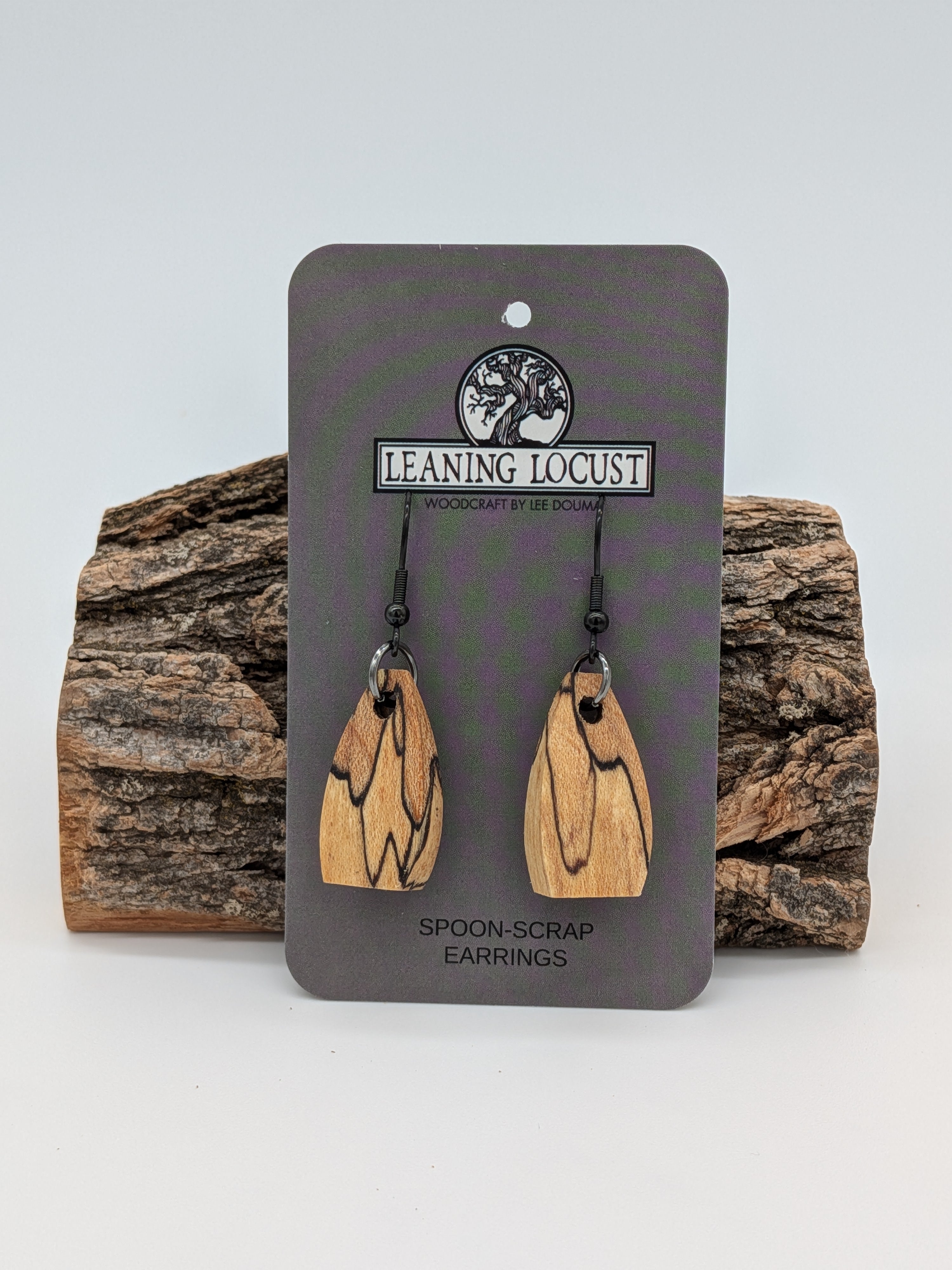 These “spoon-scrap earrings” were made either from pieces of wood that were beautiful but not strong enough to become a utensil. This particular wood came from the back yard of some friends a few miles down the road.
