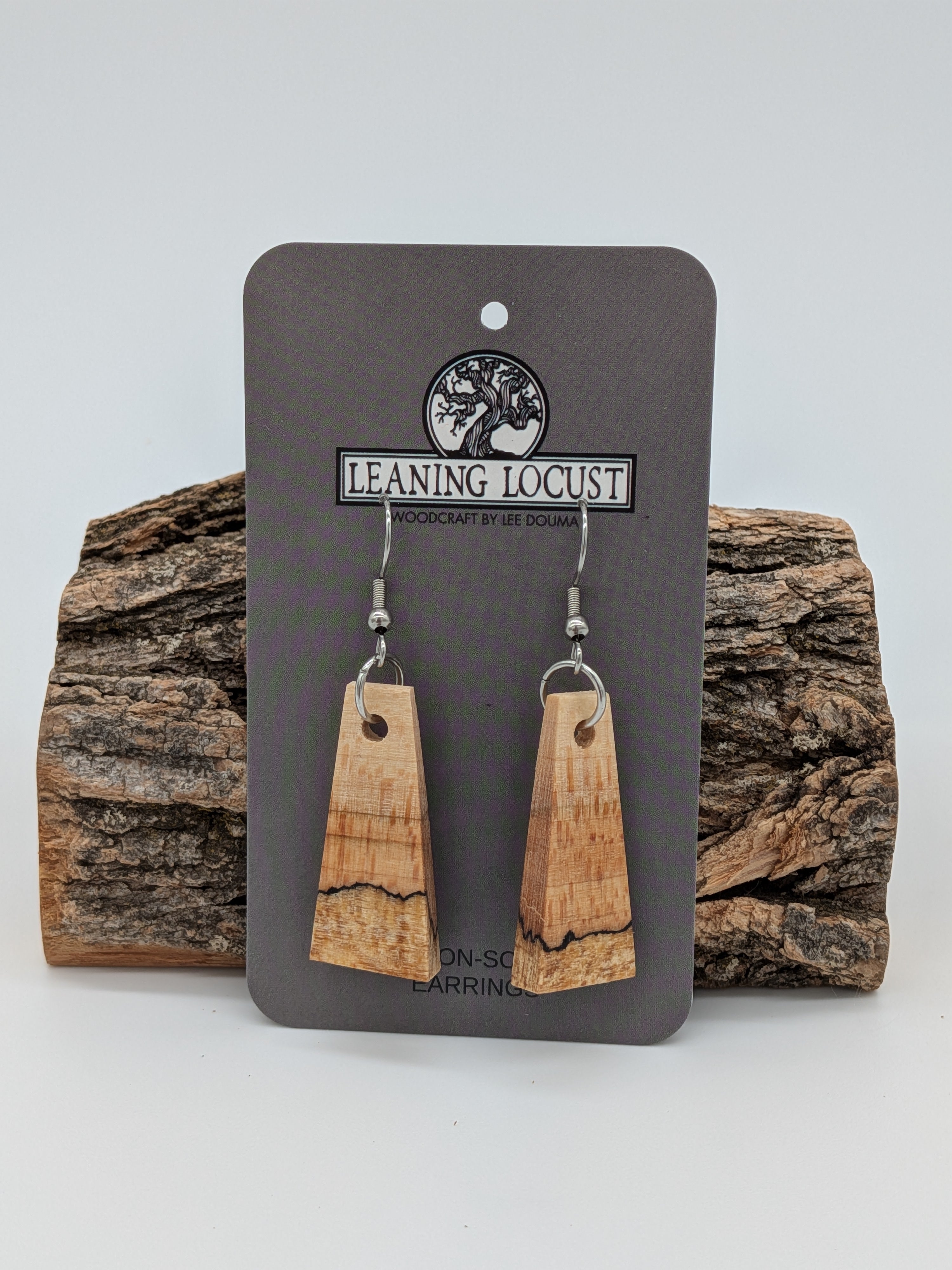 These “spoon-scrap earrings” were made either from pieces of wood that were either left over from the production of spoons or wood that were beautiful but not strong enough to become a utensil. This particular wood came from the back yard of some friends a few miles down the road.